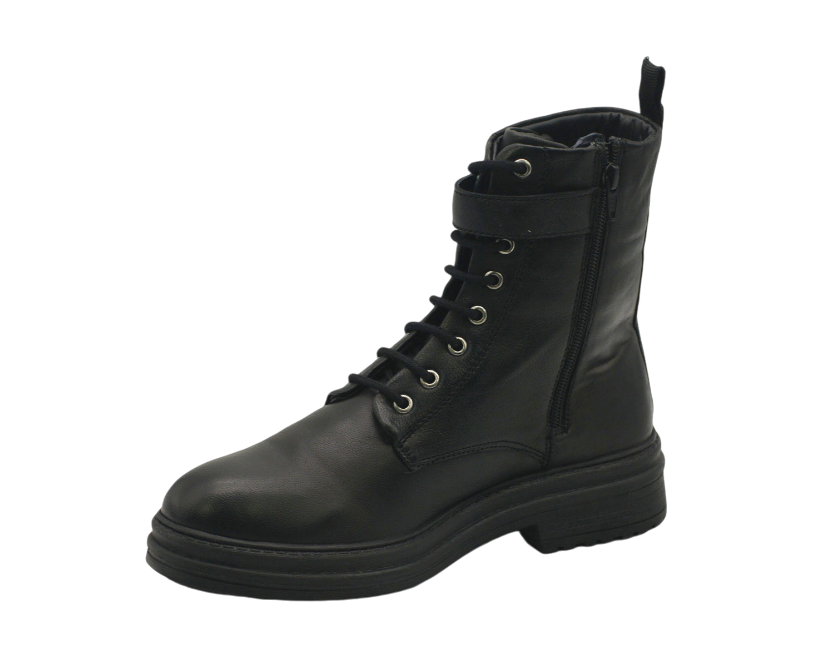 Com atacadores, fecho lateral e puxador traseiro para facilitar o calçar. Com pormenor de tira com fivela ajustável no tornozelo.